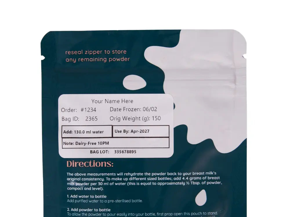 - After opening a bag of your breast milk powder, be sure to reseal the zipper tightly. If left unsealed, the powder can quickly absorb moisture, potentially leading to bacterial growth since your milk wasn't pasteurised during the freeze-drying process. Therefore, it's important to reseal the bag after opening and use the powder within 3 days.